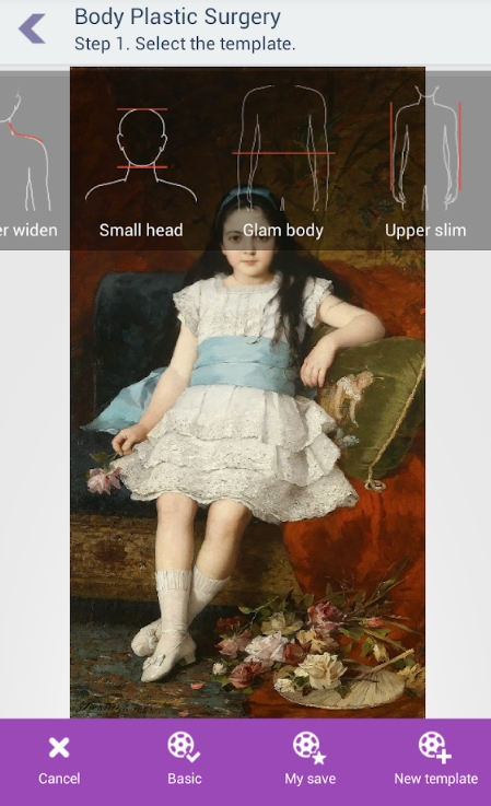 部分テンプレート適用して腰をスリムに/肩広く/顔小さく/グラマーな体つきに/上、下半身スリムにだけでなく、写真で自分だけ高く、写真で自分だけ長い脚に!等その他様々なテンプレートが用意されています。
